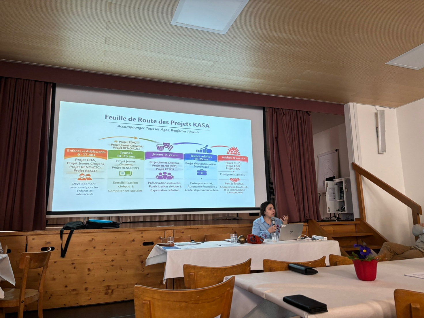 Monika Sargsyan a ensuite brossé une vaste fresque relative à la situation de son pays.       A savoir, compte tenu du contexte géopolitique, les importants projets que KASA met en place pour former des jeunes, des animateurs, des enseignants et encourager la résilience via la prise en compte de la richesse du patrimoine. Et Azniv a évoqué les voyages passés et à venir devant un public heureux de retrouver leur guide fétiche !               Il appartenait à Michel Menny, du Conseil d’administration arménien, d’exprimer son admiration pour le professionnalisme et la qualité du travail qu’accomplissent les équipes de KASA-FHS, sous la houlette avisée de leur directrice.